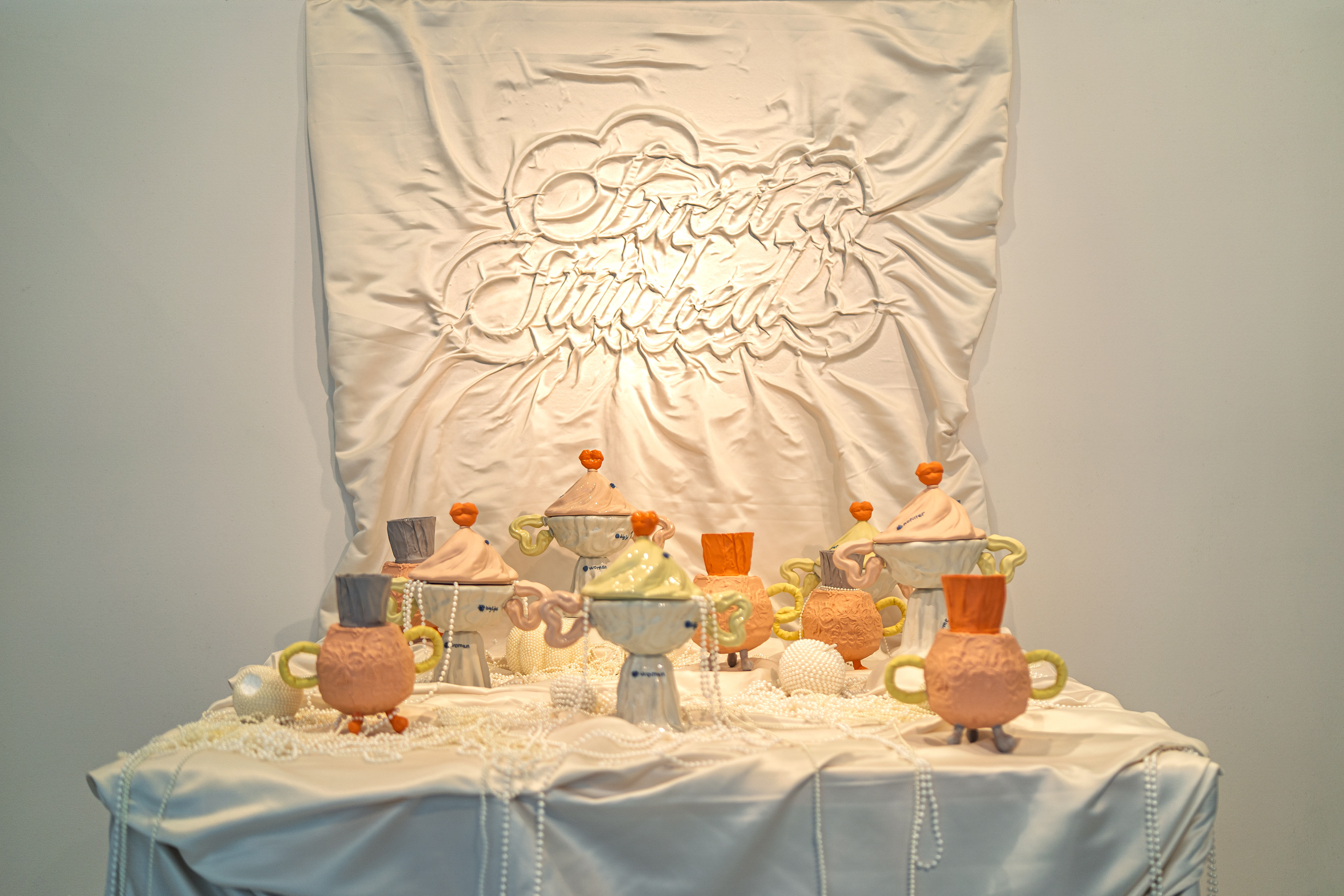 Projekt představuje kolekci porcelánových šperkovnic, které vycházejí z tvaru polévkové mísy – symbolu domácnosti, péče a ženské role hospodyně. Tento archetyp reinterpretujeme v kontextu současného ženství a digitální doby. Instalace odkazuje na motiv stolování, stoly přetékají perlami.